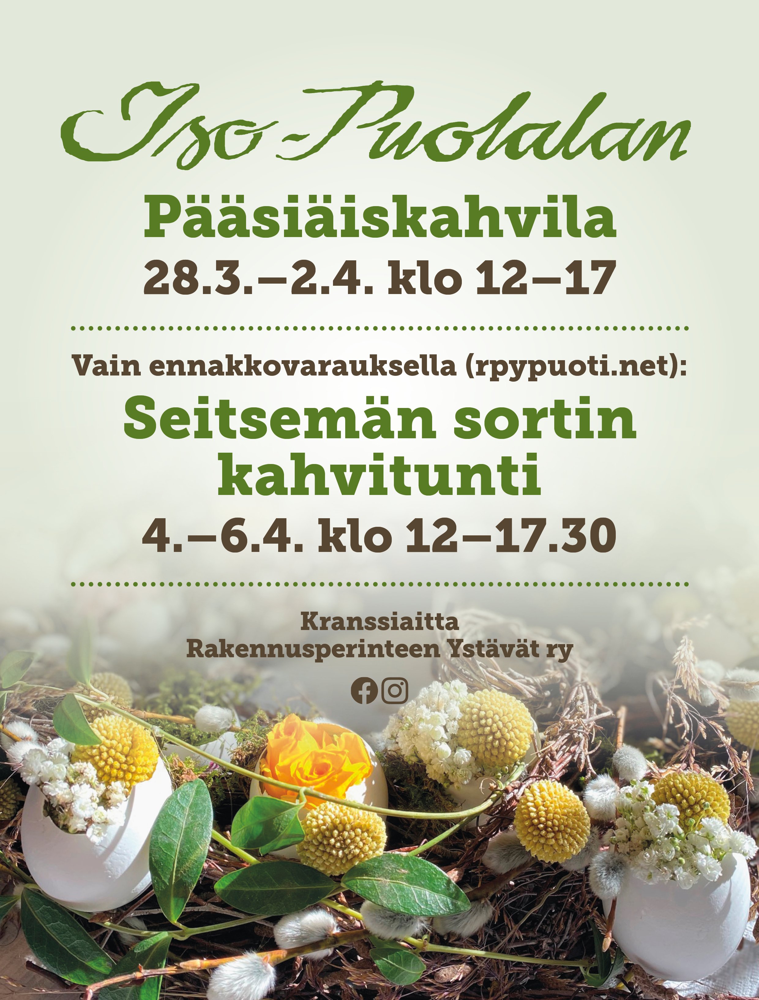 Tule nautiskelemaan keväisistä tunnelmista ja kotitekoisista leivonnaisista Iso-Puolalan kahvilaan! Pääsiäiskahvila on avoinna la 28.3.– to 2.4. klo 12–17.