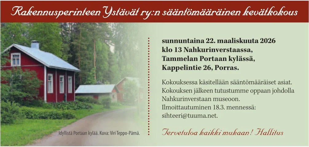 Rakennusperinteen Ystävät ry:n sääntömääräinen kevätkokous sunnuntaina 22. maaliskuuta 2026 klo 13 Nahkurinverstaassa, Tammelan Portaan kylässä, Kappelintie 26, Porras. Kokouksessa käsitellään sääntömääräiset asiat. Kokouksen jälkeen tutustumme oppaan johdolla Nahkurinverstaan museoon.