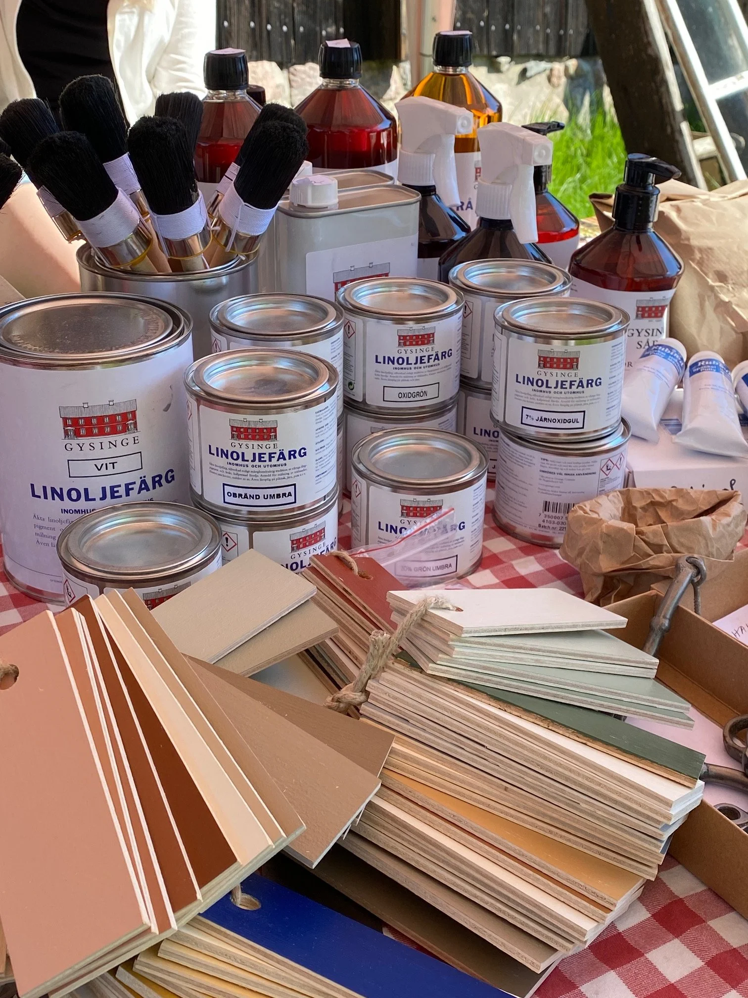 Myynnissä Rakennusperinteen Ystävien tuotteita, mm. ikkunankunnostajan tarvikkeita, heloja, kittiä, pellavaöljymaaleja ja alan kirjallisuutta.